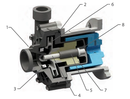 • Gwarancja braku wycieków: Wytworzone pole magnetyczne powoduje obrót wirnika bez fizycznego kontaktu części ruchomych. Hermetyczna tylna obudowa, umieszczona między złączami magnetycznymi, trwale izoluje część hydrauliczną, oddzielając ją od silnika i otoczenia.