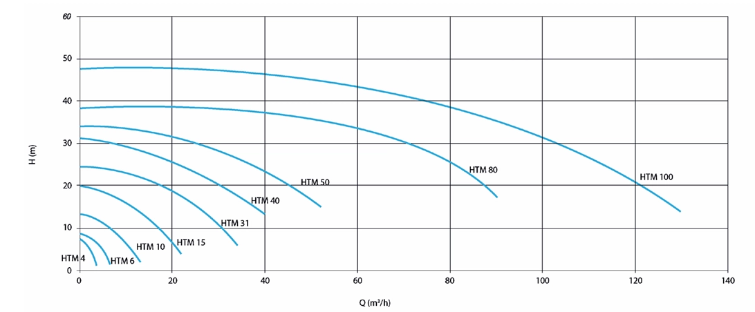 • Jednostki średnie i duże (HTM 31-100): Pokrywają zapotrzebowanie przemysłowe aż do 130 m3/h przy wysokości podnoszenia do 48 metrów słupa cieczy.